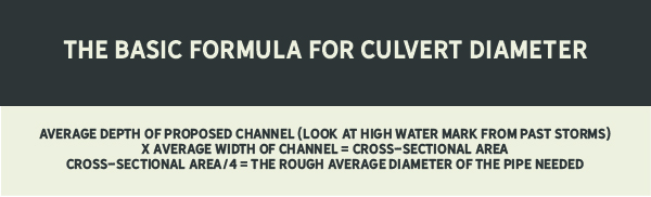 To transport more water with smaller diameter culverts, you may also install two or more culverts side-by-side to handle heavy flows — but too narrow a culvert can become blocked with debris, even if there are many of them together. See the related graphic for a basic culvert diameter formula.